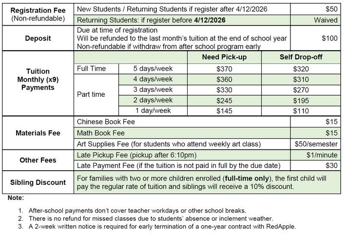 The following classes are offered in our after-school program: Chinese, Mathematics, Dance and Art classes at no extra charges.